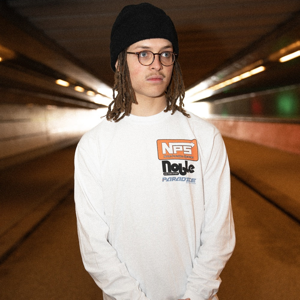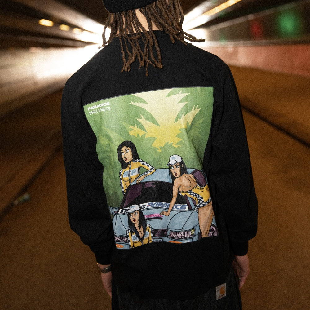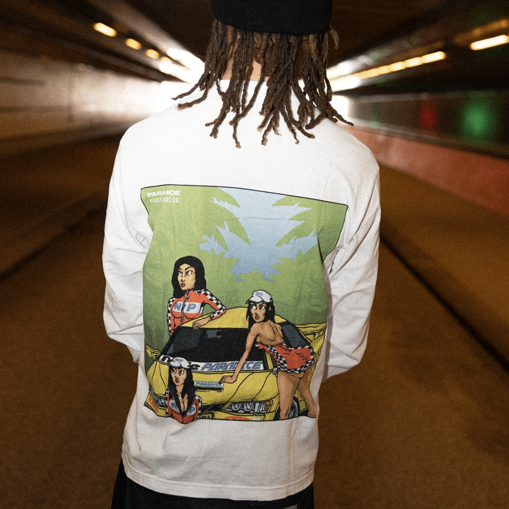 A collaboration T-shirt with Rotterdam-based streetwear brand Paradice. The long-sleeve features front and back graphics by Steef Offerhaus, inspired by racing tech and the cult arcade classic OutRun. Photography by Kaka Lee